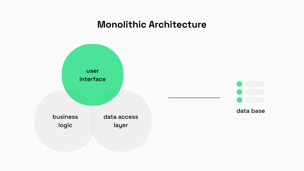 Monolithic architecture is the classic, traditional approach, and it’s where most applications begin their journey. A monolith is a single, massive codebase where all the features like user authentication, payments, dashboards, and so on, live together under one roof. Think of it as a corporate headquarters where every department works in the same building.