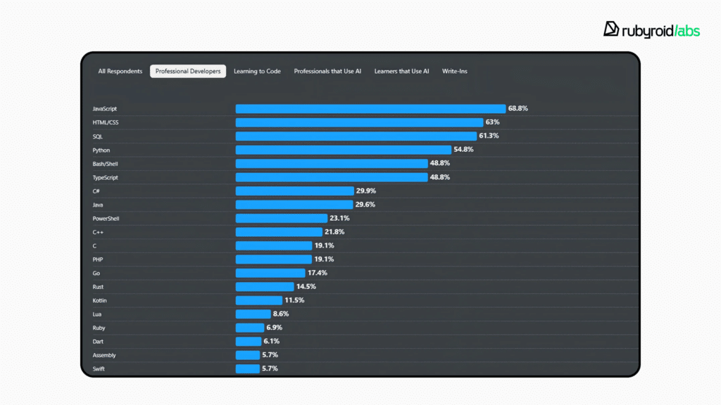 So, according to the Stack Overflow 2025 survey, JavaScript sits at the top, with roughly 68% of pros having worked with it over the past year. Python’s momentum hasn’t slowed, especially among people learning to code and those knee-deep in AI work. TypeScript has crossed the threshold from optional tooling to standard infrastructure. Go continues its steady climb, Rust gets more admiration than actual adoption. Ruby’s still around, quietly powering revenue-generating systems without much fanfare.