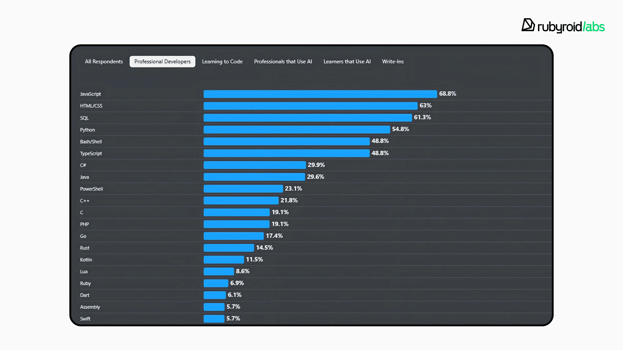 JS, Python, and Ruby are old but gold. Go and Rust are newer but passionate and growing. Swift and Kotlin are platform-driven and steadily maturing.