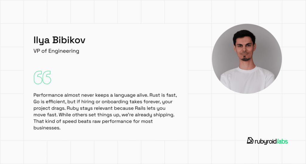 Of course, there are criteria for performance and scalability, which are frequently taken as the potential for languages’ long lives. We consulted our VP of engineering Ilya Bibikov, and this is what he says on that point: