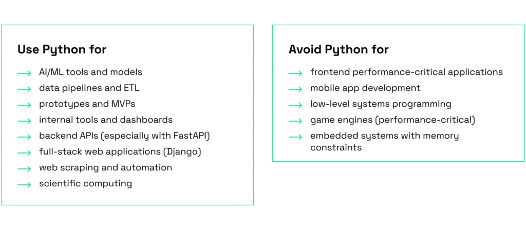 | Python | Data science, automation, AI, backend | Huge ecosystem for AI/ML, easy to read | Slower performance in high-load systems | AI tools, scientific computing, internal dashboards, MVPs | 4 | 4 |