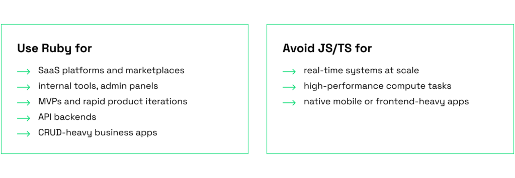 | Ruby | Web development, MVPs, internal tools | Rails which speeds up development | Slower runtime, fewer devs available | SaaS platforms, CRMs, admin panels | 5 | 3 |