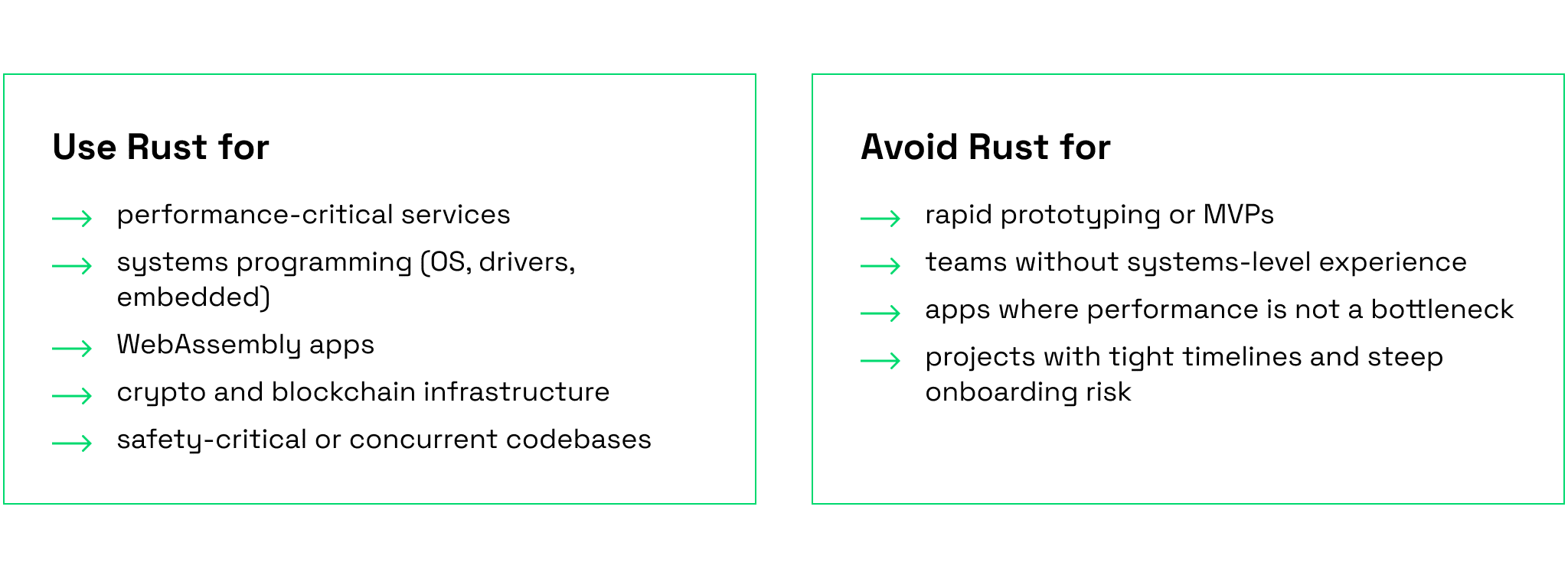 | Rust | Systems programming, high-perf apps | Safety + performance without garbage collector | Steep learning curve, longer dev time | Embedded systems, CLI tools, performance-critical apps | 2 | 2 |