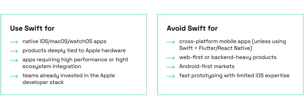 For startups or teams building for both iOS and Android, Swift alone isn’t enough, as you’ll likely need a parallel codebase in Kotlin or a cross-platform framework.