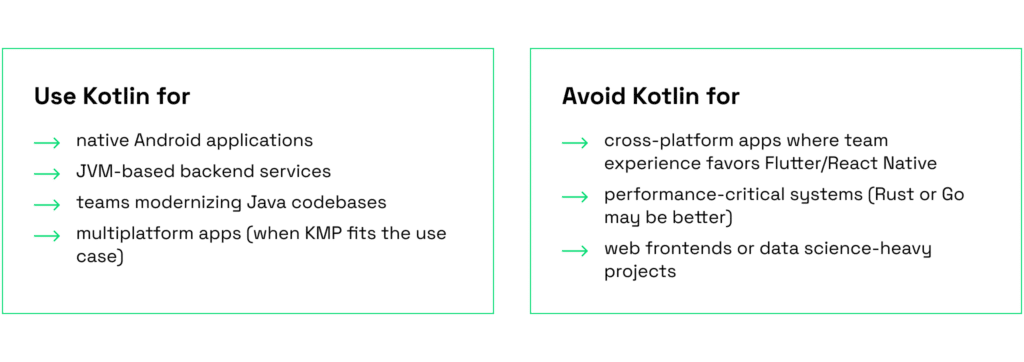 Kotlin’s ecosystem outside of Android and the JVM is still growing. For some use cases (e.g. data science, web frontends), it lags behind more established languages.
