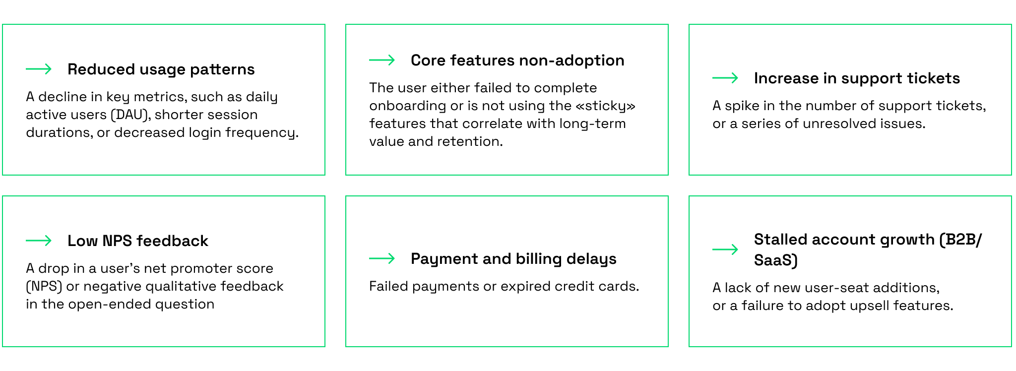 Churn itself is a lagging indicator. The goal is to identify the leading indicators, behavioral triggers that predict a user is at high risk of “silent churn” or churning in the near future. These can be: