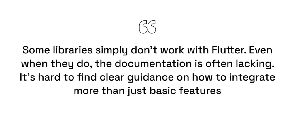 | Custom wrapper overhead | If a native SDK lacks a Dart package, write Swift/Kotlin wrappers yourself. | Extra maintenance and vendor integration risk. |